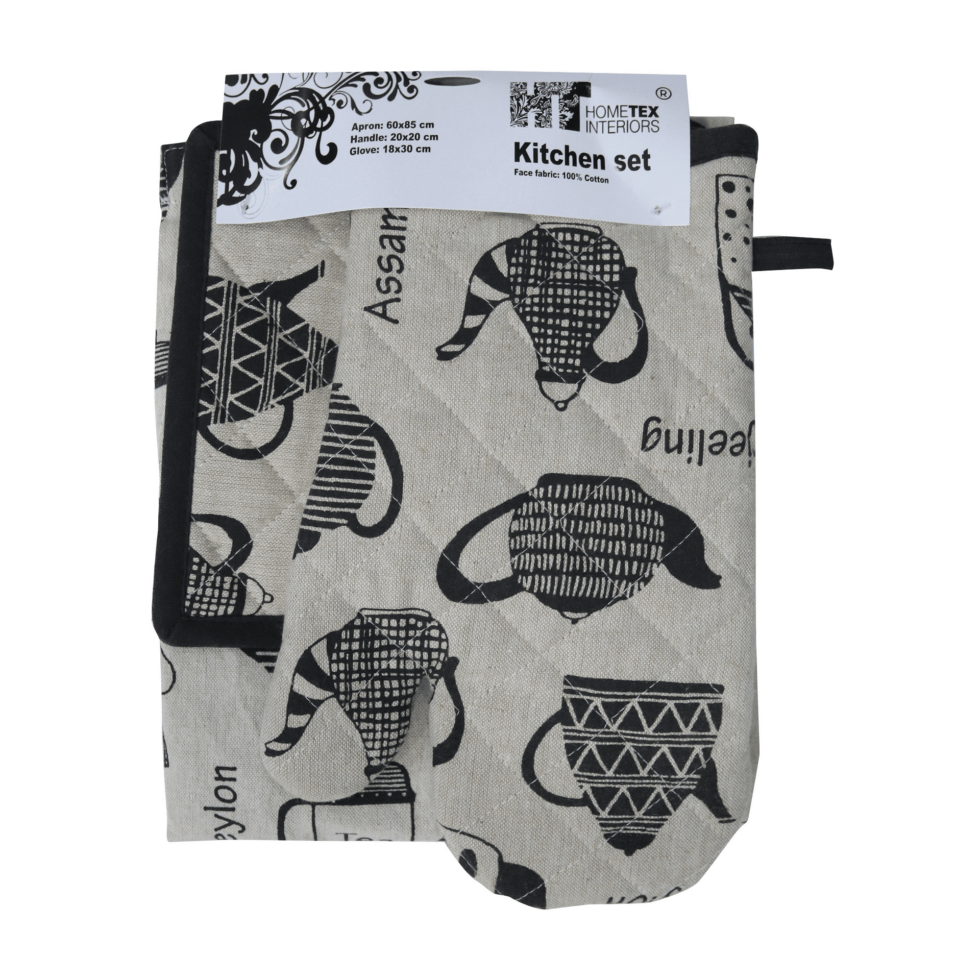 • Περιεχόμενο σετ: 1 ποδιά, 1 πετσέτα για κατσαρόλες, 1 γάντι φούρνου